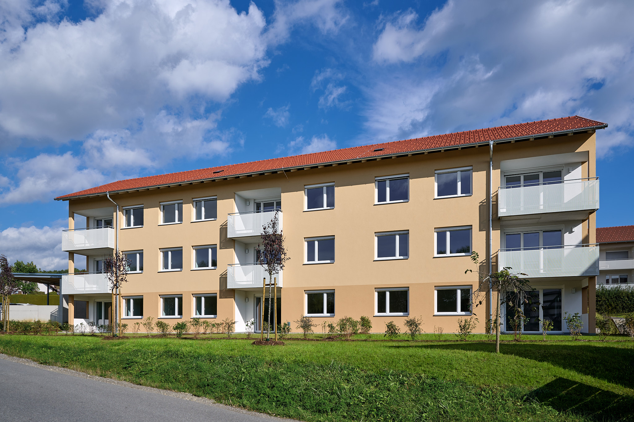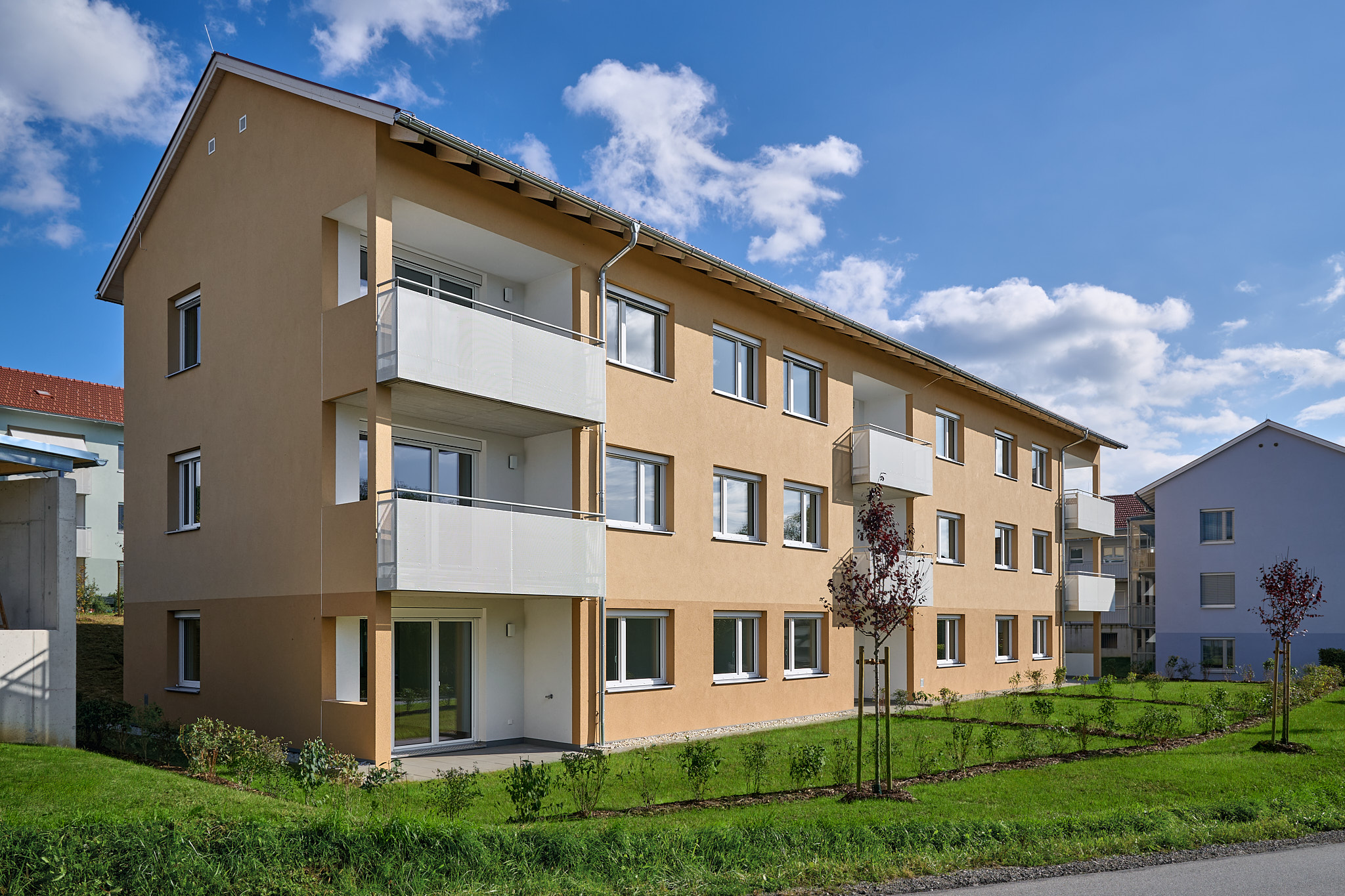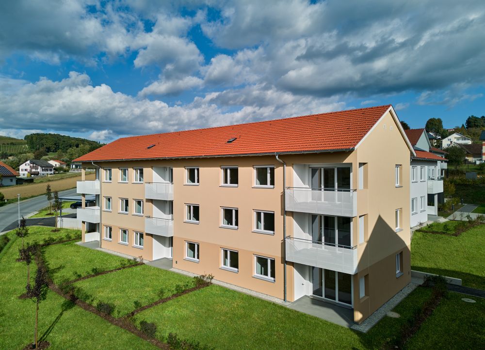 Die elf landesgeförderten Mietwohnungen befinden sich in einem dreigeschossigen L-Haus. Die Größe der Zwei- bis Vier-Zimmer-Wohnungen bewegt sich zwischen 54 bis 89 Quadratmetern. Die Wohnungen zeichnen sich durch gut durchdachte Grundrisse aus und bieten den Bewohnerinnen und Bewohnern neben einer geräumigen Wohnfläche innen auch einen Balkon oder eine Terrasse mit einer zugeordneten Gartenfläche. Alle Wohnungen sind ebenso mit einer Küche inklusive der Elektrogeräte ausgestattet. Jeder Wohnung wird zudem ein Kellerabteil zur Verfügung stehen, das zusätzlichen Stauraum bietet. Je Wohnung ist ein überdachter Pkw-Abstellplatz inkludiert.