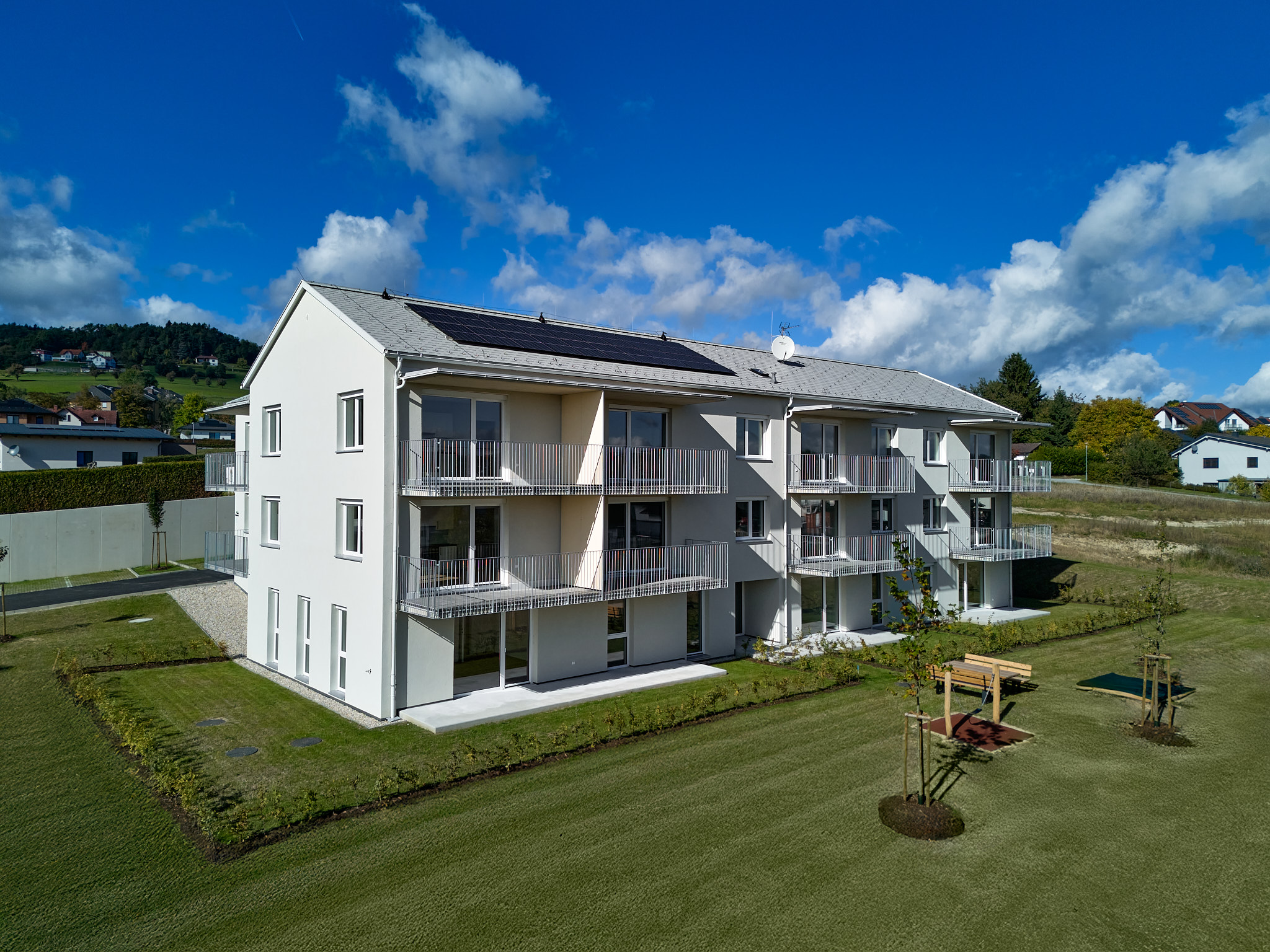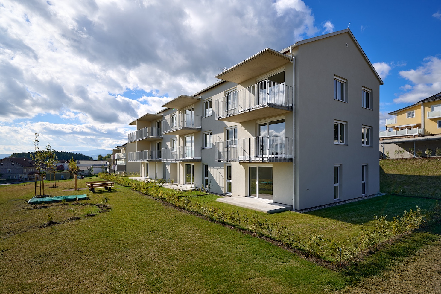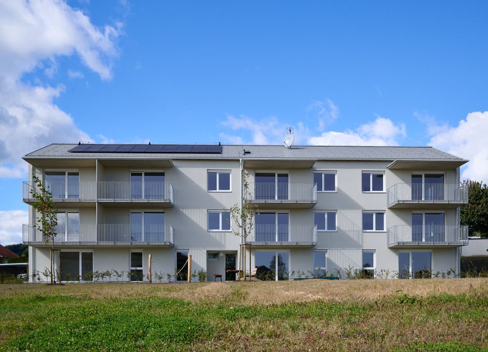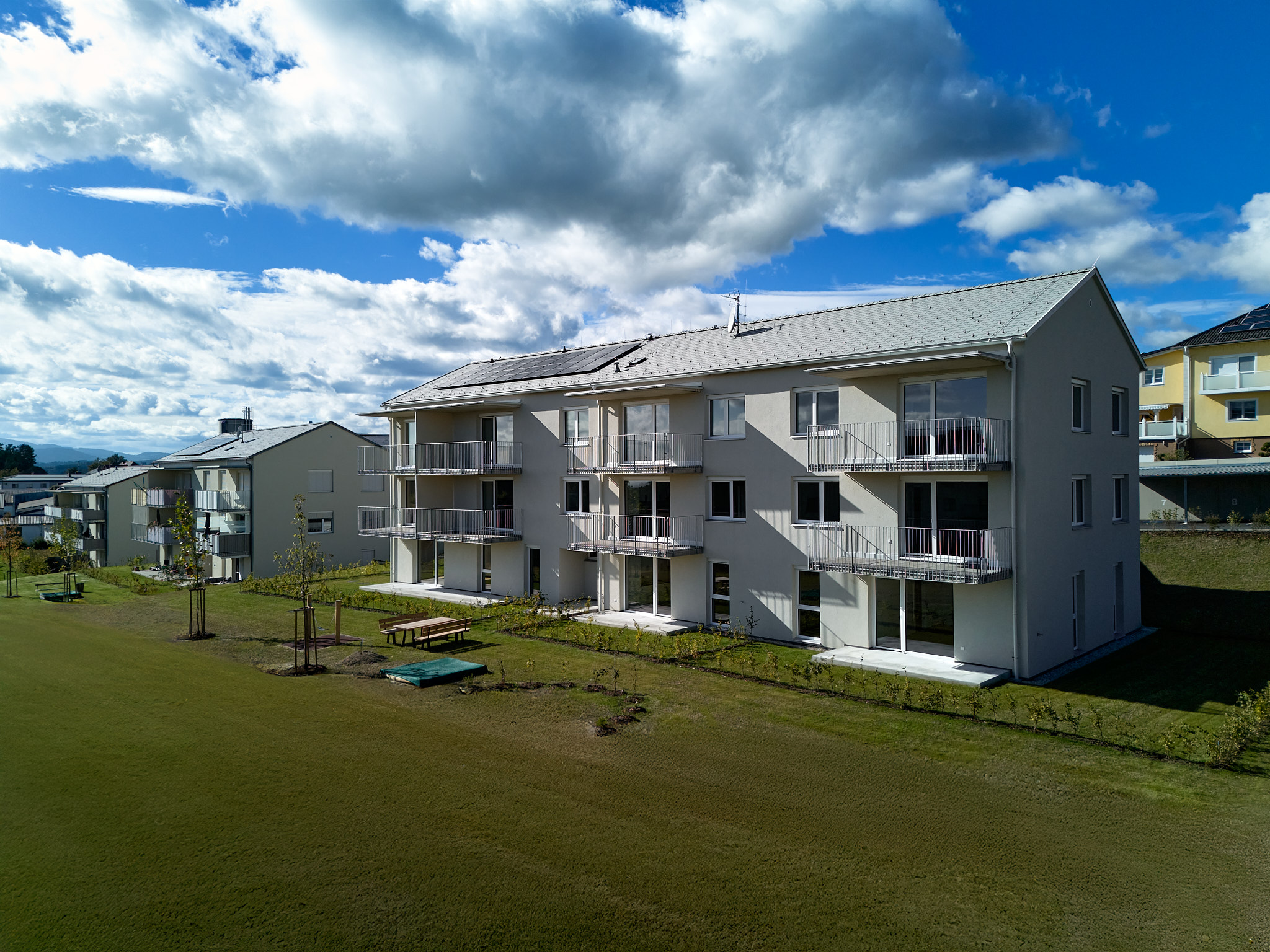 Das dritte Gebäude in der Bahnhofsiedlung wurde nun an die neuen Bewohner:innen übergeben. Entstanden sind hier 13 landesgeförderte Mietwohnungen. Die Größe der Zwei- bis Vier-Zimmer-Wohnungen bewegt sich zwischen 53 bis 89 Quadratmetern. Jede der Wohnungen verfügt über einen Balkon oder Terrasse sowie zugeordnete Gartenflächen. Alle Wohnungen sind mit einer Küche inklusive der Elektrogeräte ausgestattet. Den Bewohner:innen steht zudem ein Kellerabteil zur Verfügung, das zusätzlichen Stauraum bietet. Je Wohnung ist ein überdachter Pkw-Abstellplatz inkludiert. Ebenso sind Besucher:innenparkplätze bei dem Wohnprojekt vorhanden.