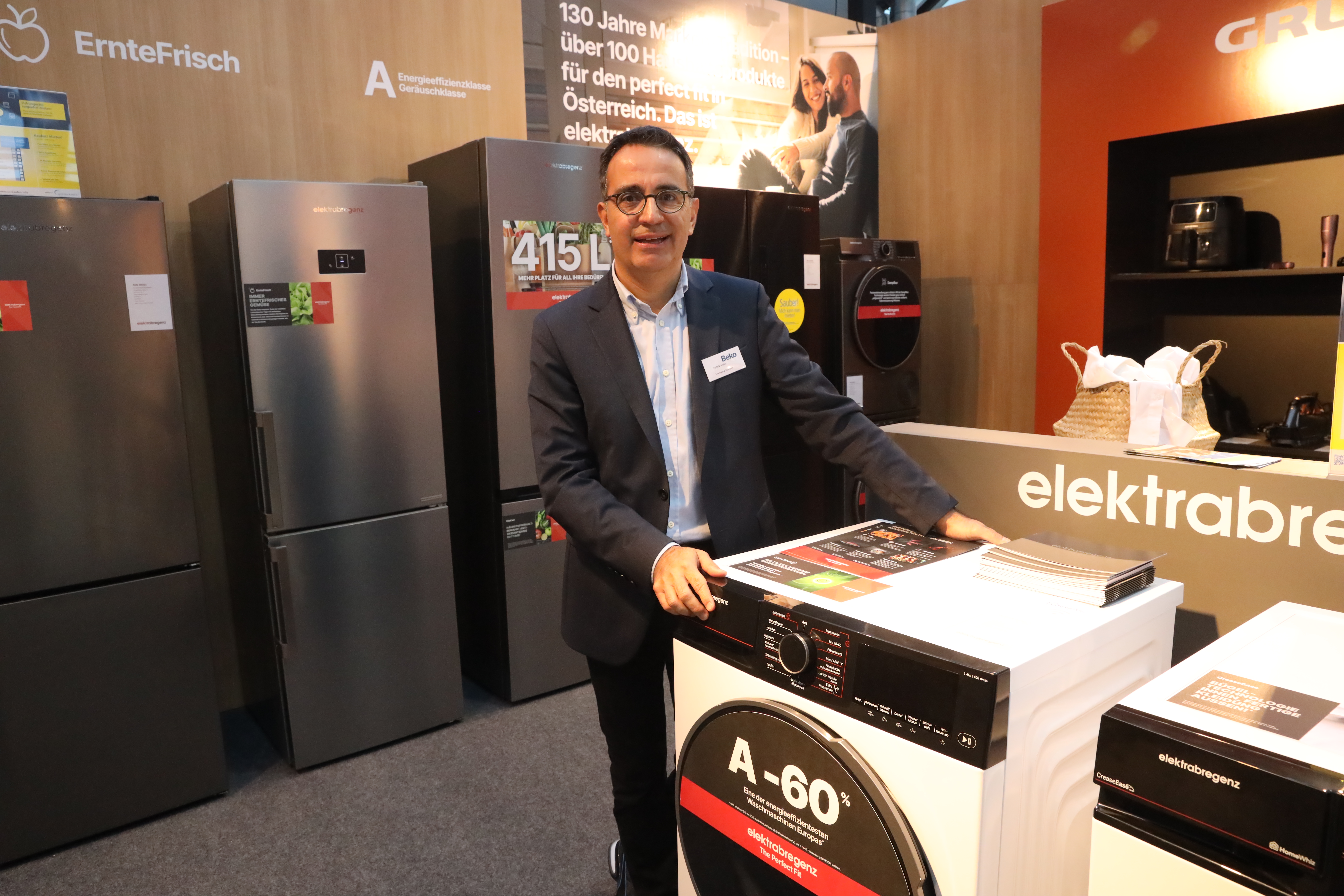 EFHT_Beko_1: Beko Austria-Geschäftsführer Evren Aksoy mit der A -60 %-Waschmaschine von elektrabregenz