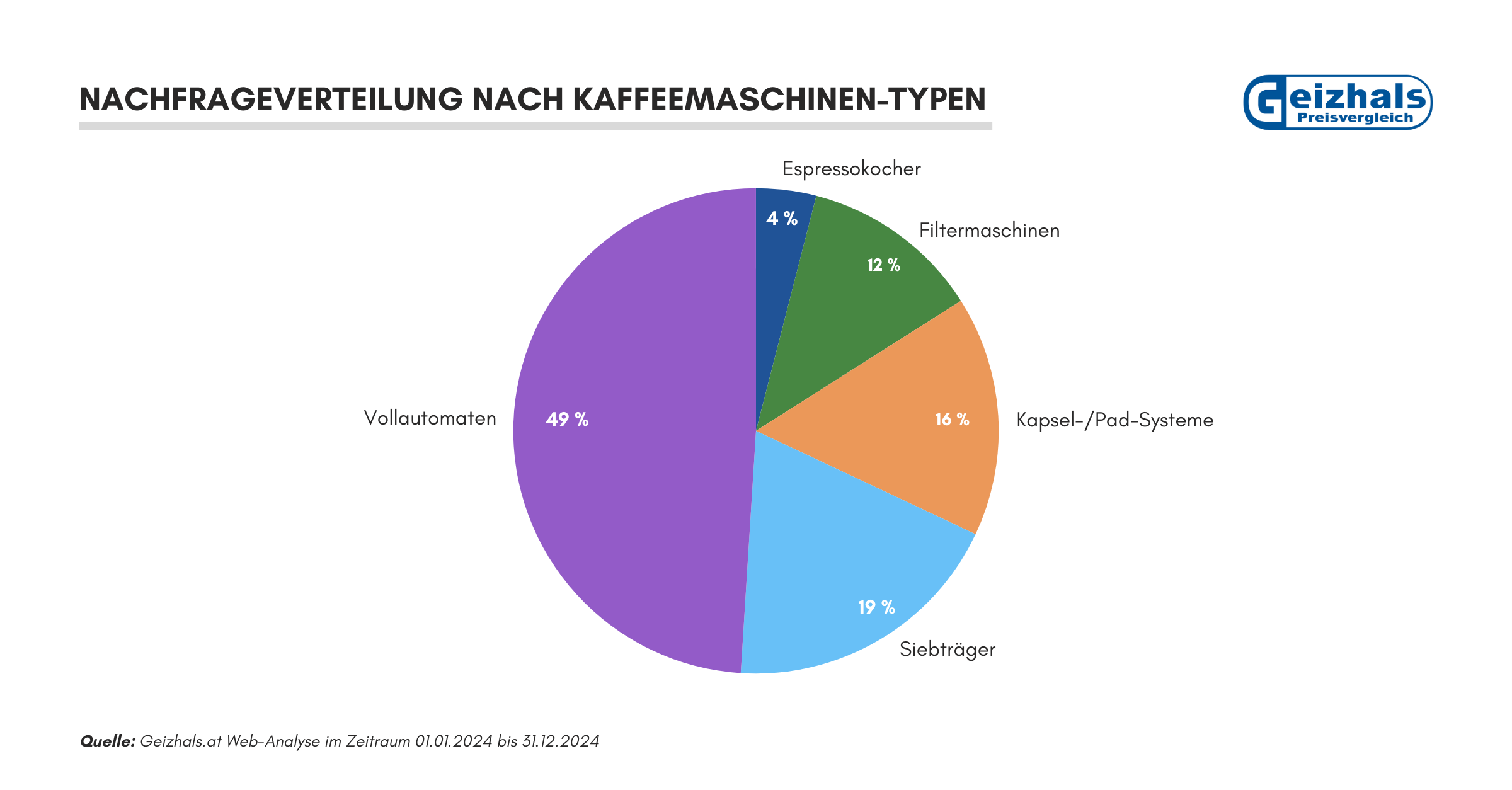 Infografik: Nachfrageverteilung nach Kaffeemaschinen-Typen auf Geizhals.at im Jahr 2024
