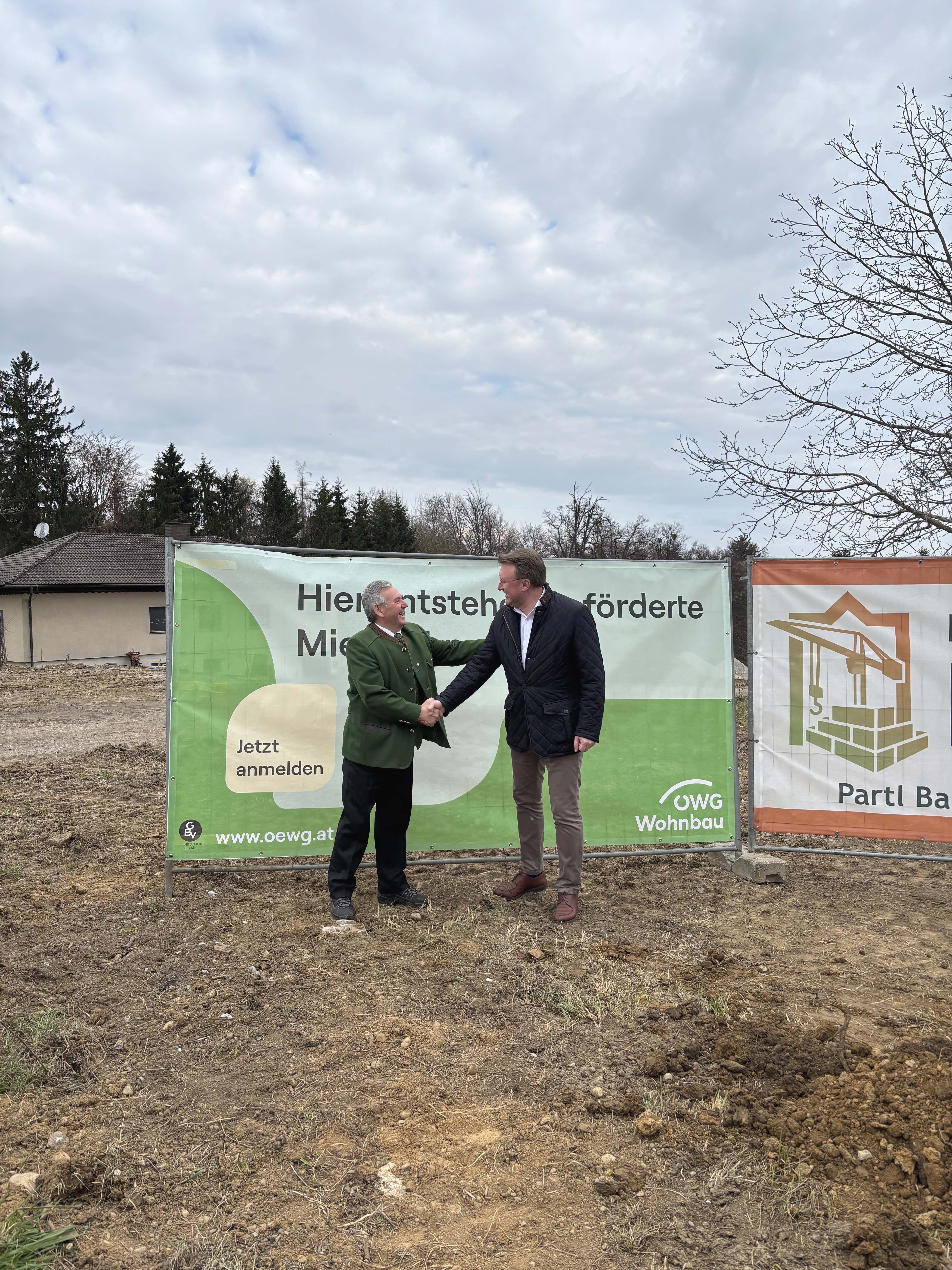 Fototext: Spatenstich in Lannach. Foto 2 (v. l. n. r.): Bürgermeister ÖkR Josef Niggas und DI Hans Schaffer (Vorstandsdirektor von ÖWG Wohnbau).
